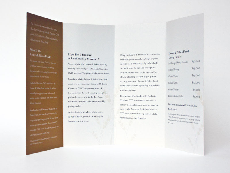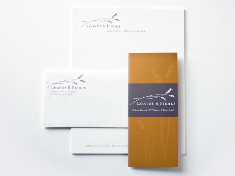 Formed an Ichthus, the Christian symbol for fish, with overlapping wheat stalks. This simplified and straightforward mark also references the biblical loaves and fishes story. The logo was applied to different fundraising event materials. Metallic inks printed on 100% recycled paper were used to dress up the materials and emphasize the gala's formality.