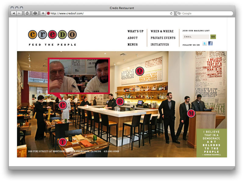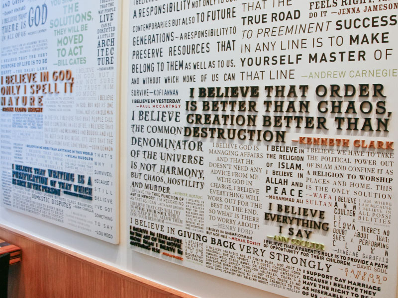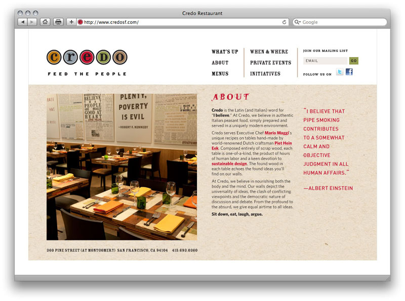 Brand a new restaurant, Credo, named after the Italian word for "I believe." Use the client-related concept that revolves around written beliefs of notable contemporary and historic world figures.
