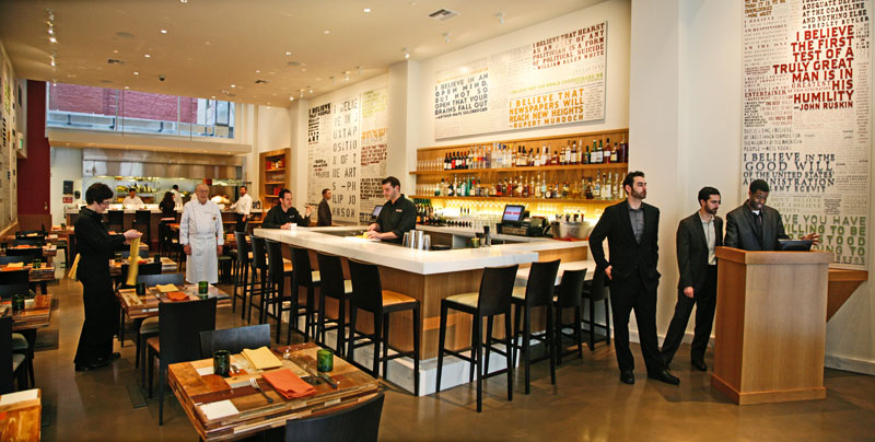 Incorporated the client's theme into the identity, typographic art panels, signage, menus, uniforms, and website. Designed sixteen 4'x10' panels with client-selected quotes sorted by theme and juxtaposed for effect. Logo referenced old-style typewriter keys to connote the timelessness of the printed word. Website captured the restaurant's ambiance and atmosphere by combining photography, sound, visuals, and color.