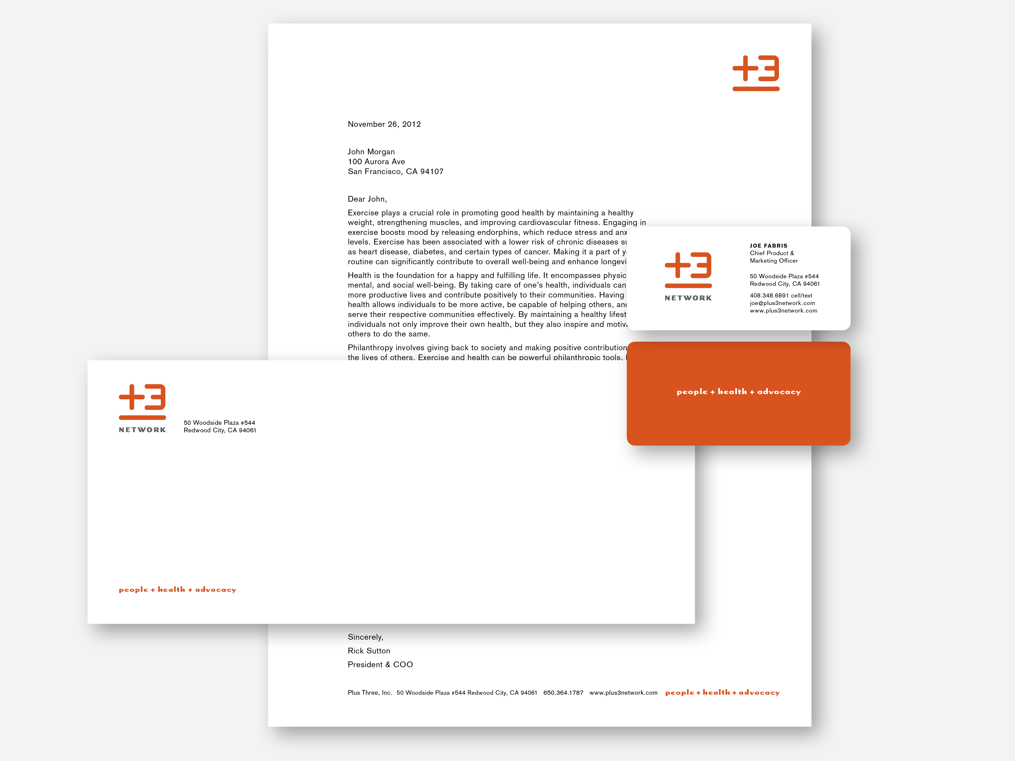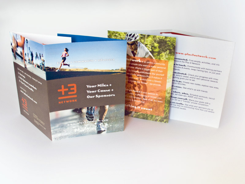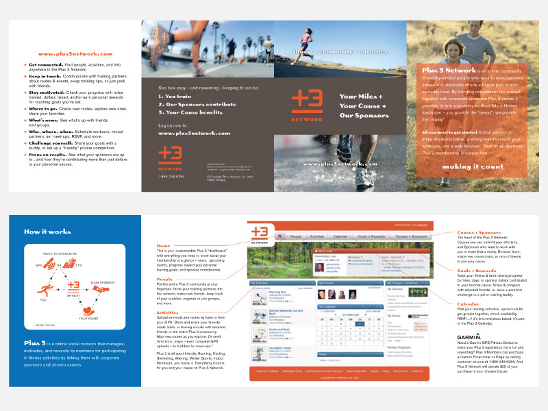 Designed and developed the brand for Plus 3 Network. Logo emphasizes the connection between three elements—people, causes, and sponsors—by presenting them in a mathematical equation that adds them together. Their sum equals the Plus 3 social network. Worked with the client's web developer to program the website using our concept designs. Designed pocket-sized brochures (handed out at races and triathlons) with custom infographics and icons to inform new users about the company and how to use the website.