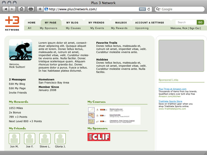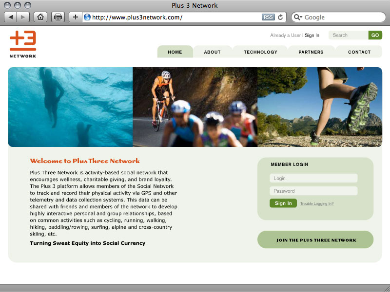 Brand a new social networking site connecting users with corporate sponsors and causes. The site converts the mileage from user-tracked daily bike rides, runs, and swims into money donated by corporate sponsors to users' charitable causes.