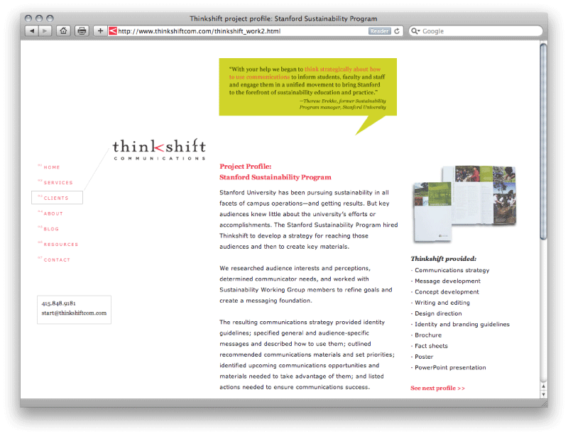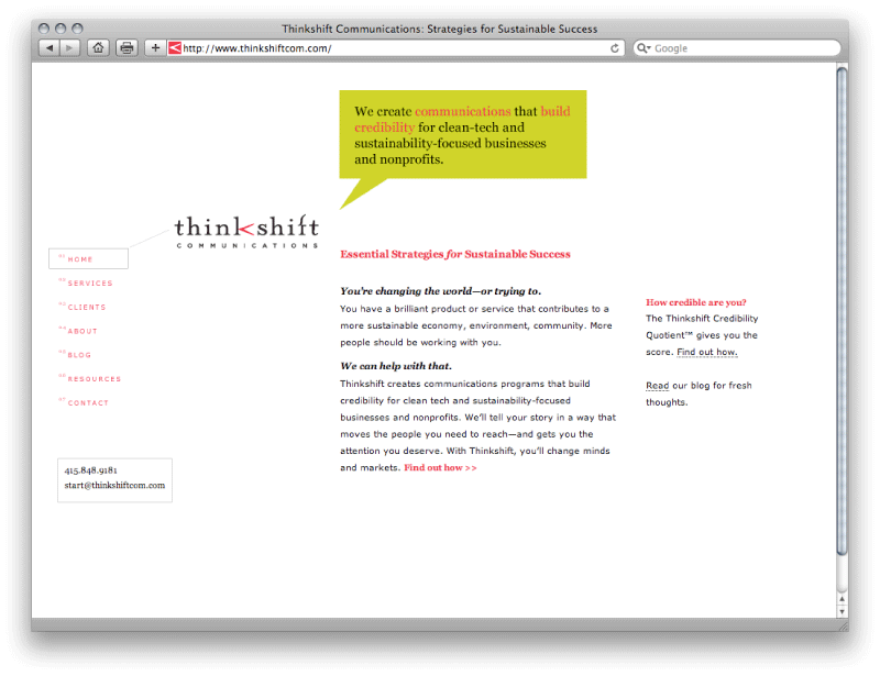 Brand ThinkShift, a marketing communications consultancy, in a way that emphasizes clean tech and sustainability-focused businesses and non-profits. Design website in a clean and simple manner so client can edit text in Dreamweaver.