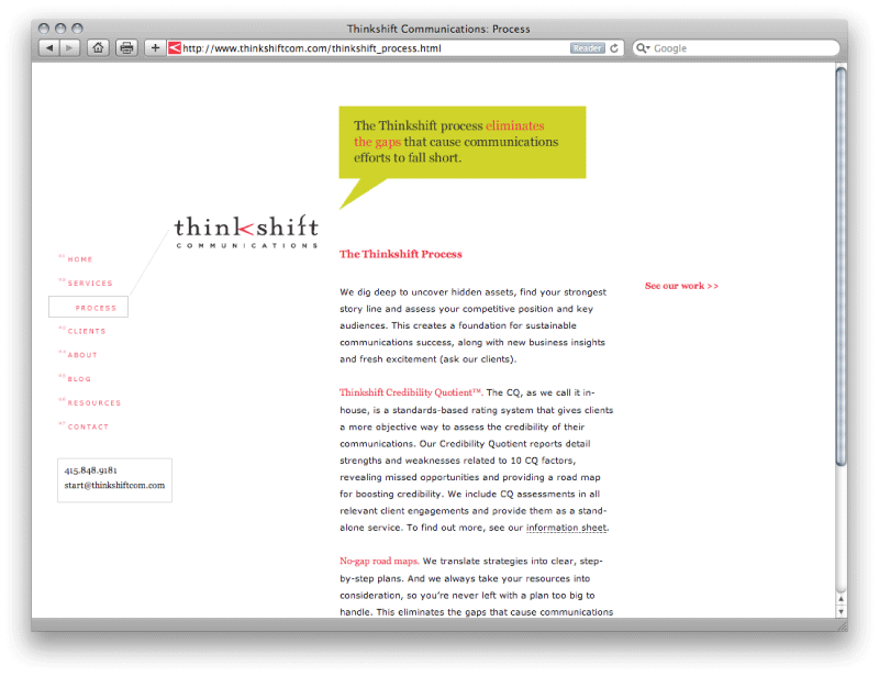 Hand-crafted a custom logotype to lend an edgier, more unique look to this forward-thinking company. Incorporated a red crescendo to symbolize both a change of direction and the end being greater than the beginning. Designed overall look, feel, navigation, and architecture of the website. Created green dialogue boxes, which allude to the firm's consultancy services, to highlight information introductions on each page of the website.