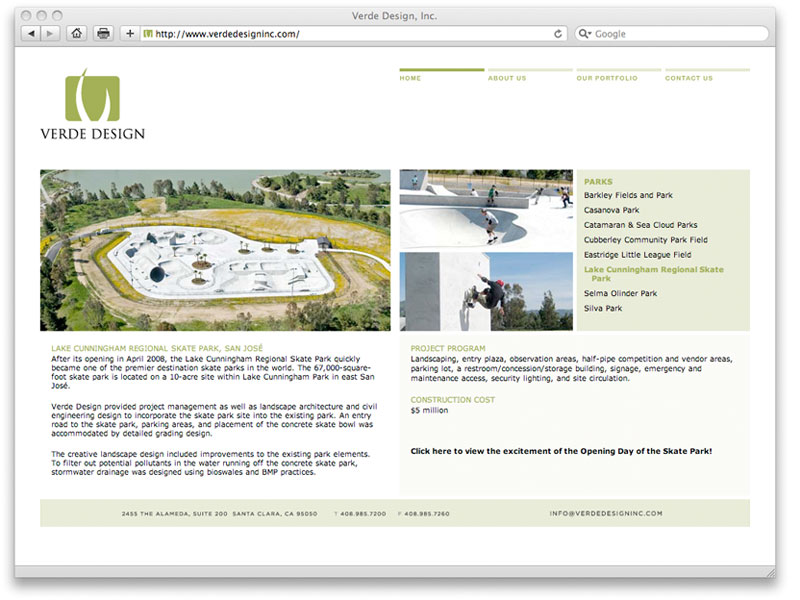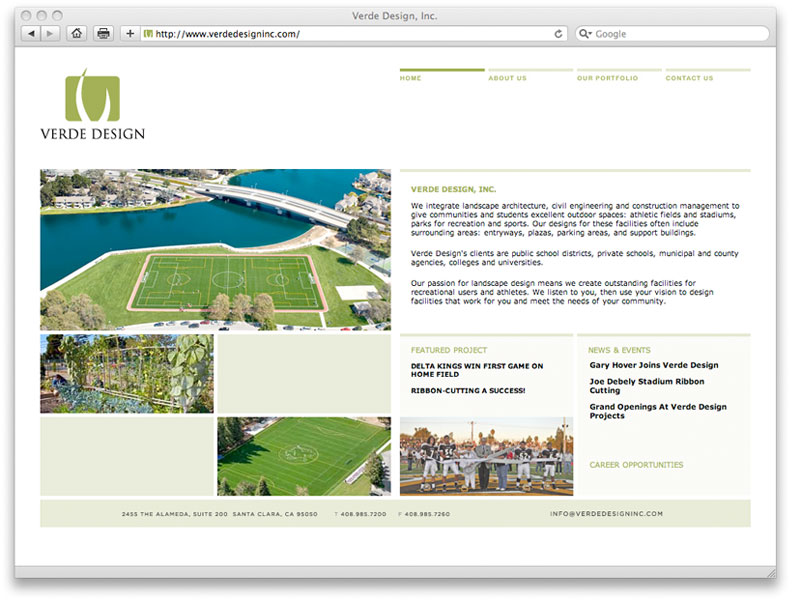 Created this website to highlight Verde Design's vast experience in designing sports facilities. We composed the text in tight geometric templates to facilitate the in-house maintenance of the site and to suggest the organized process that contributes to their success.